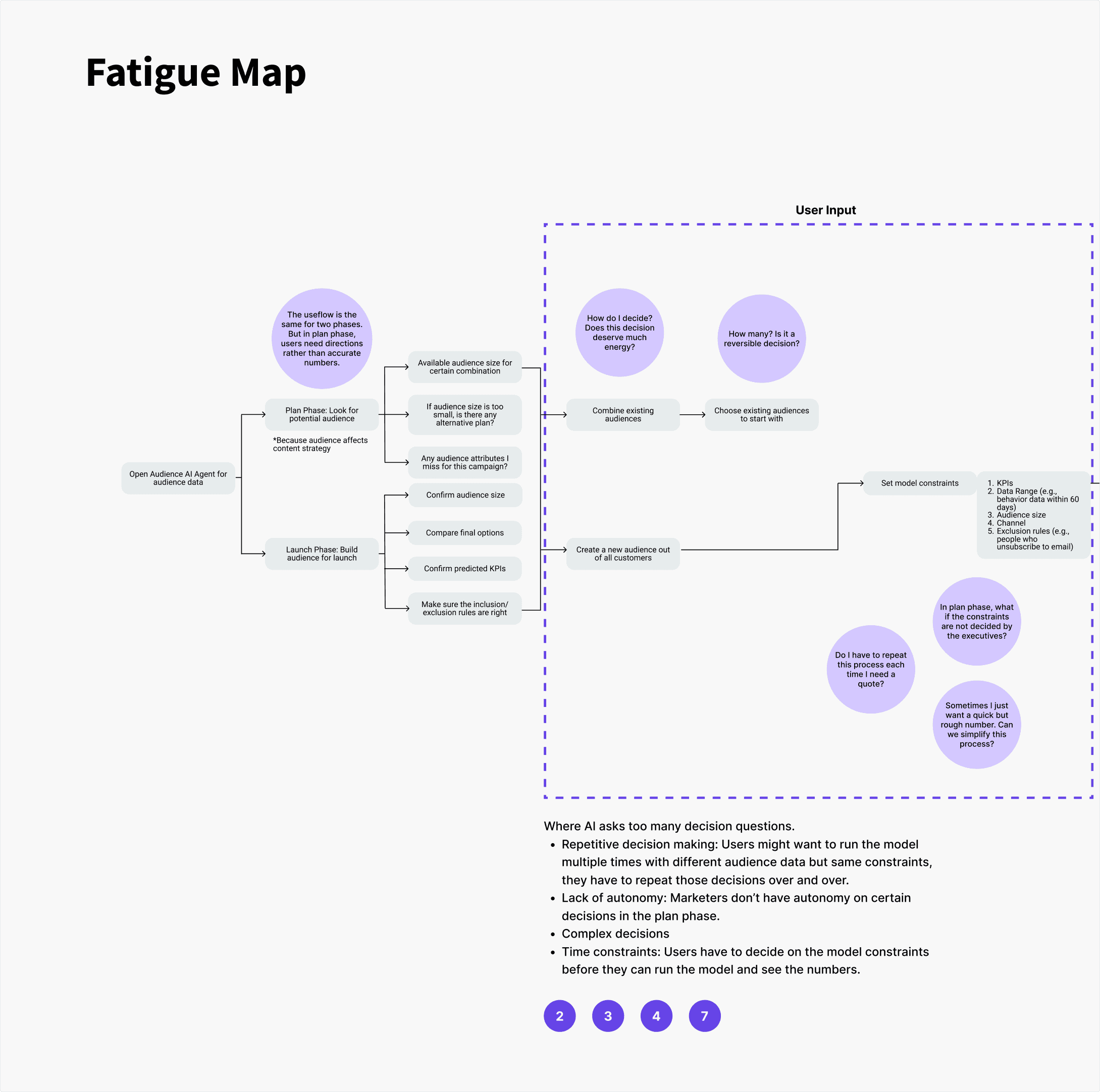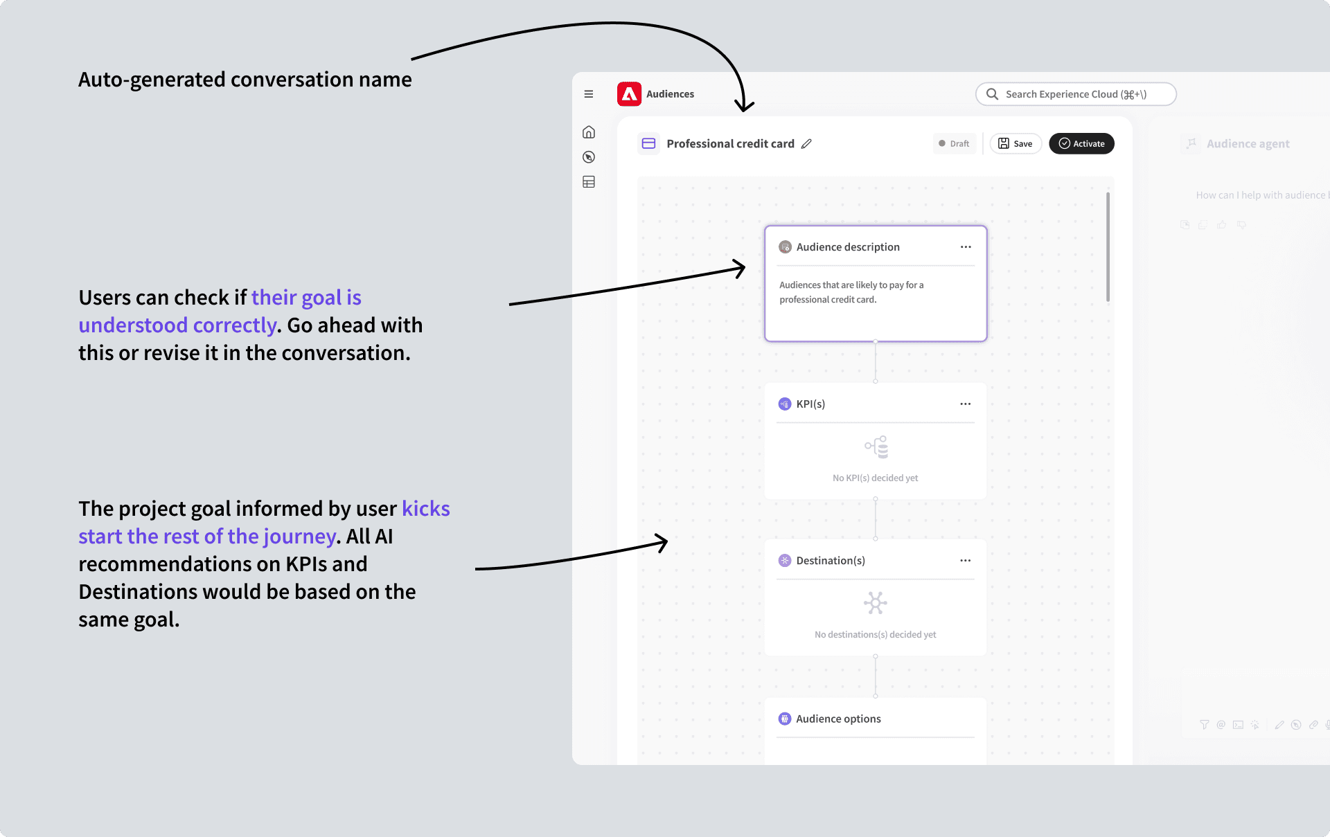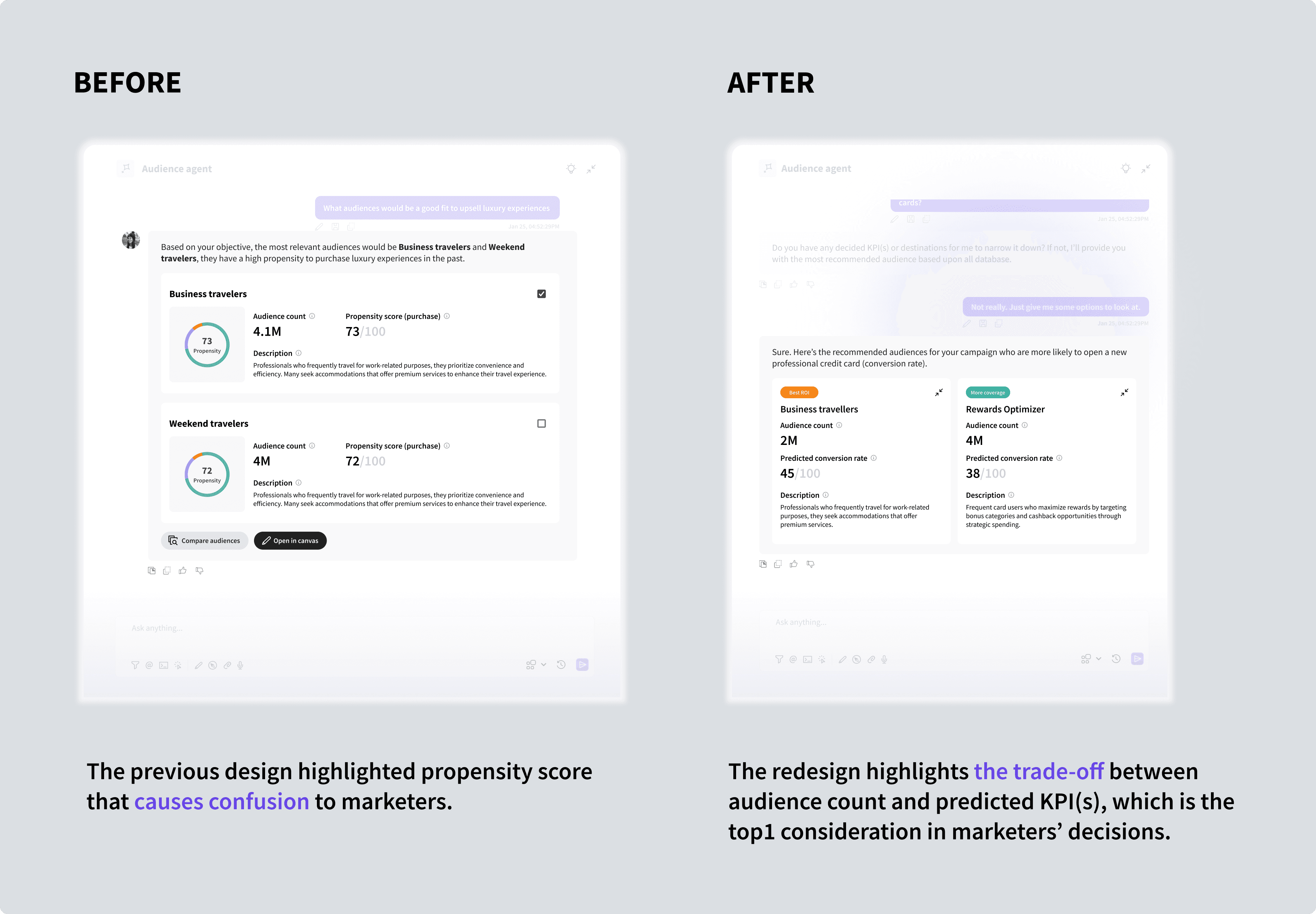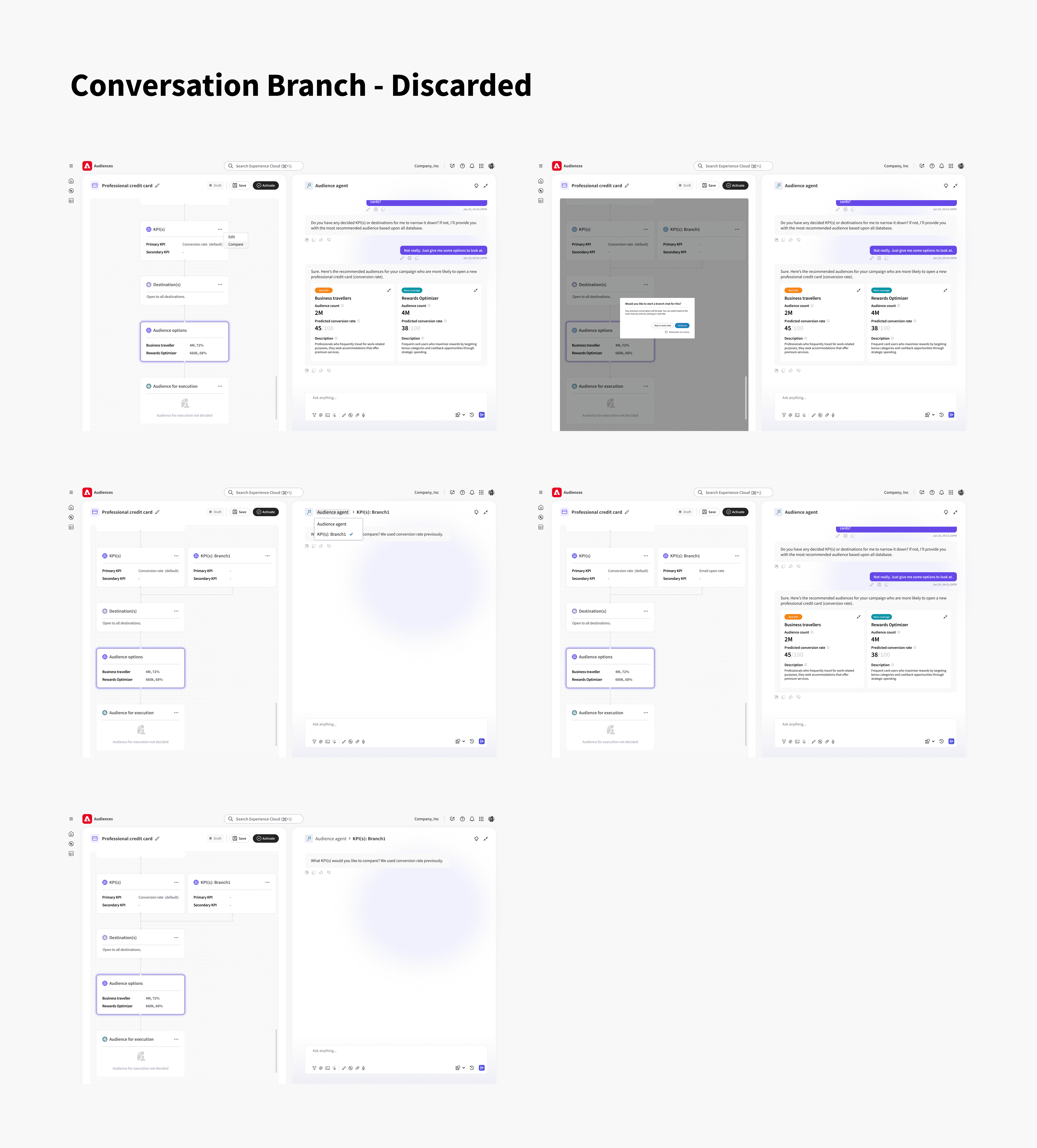 While AI agents actively provide suggestions/recommendations, users complaint that the Human-AI interaction experience in Audience Builder felt like a "rabbit hole". Unlike linear and predictable traditional interfaces, AI chat flow feels infinite and then leads to loss of control.