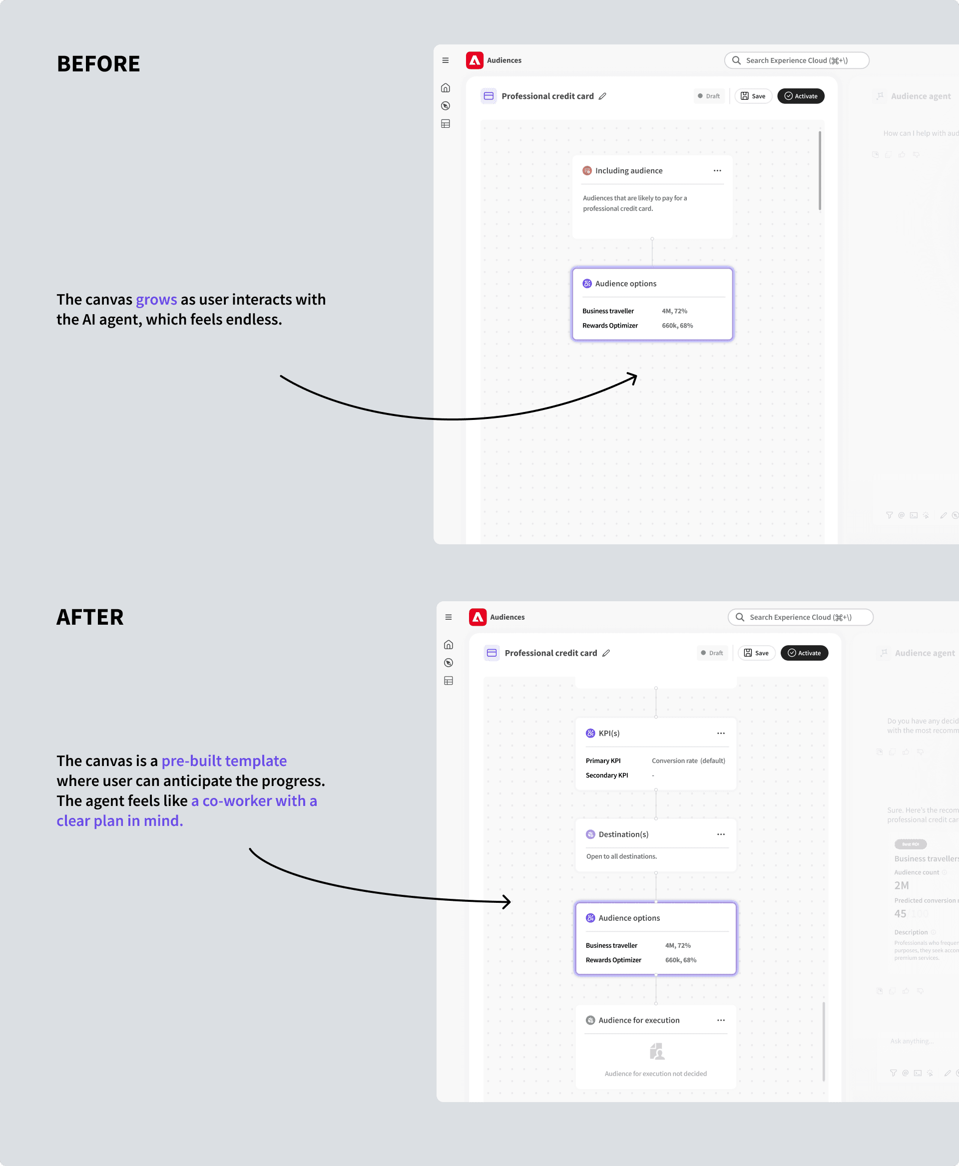 In 2025, I was excited to work with Adobe's enterprise product team in the design studio course. I spent four months reimagining a more nimble human-AI collaboration experience for Audience Builder.