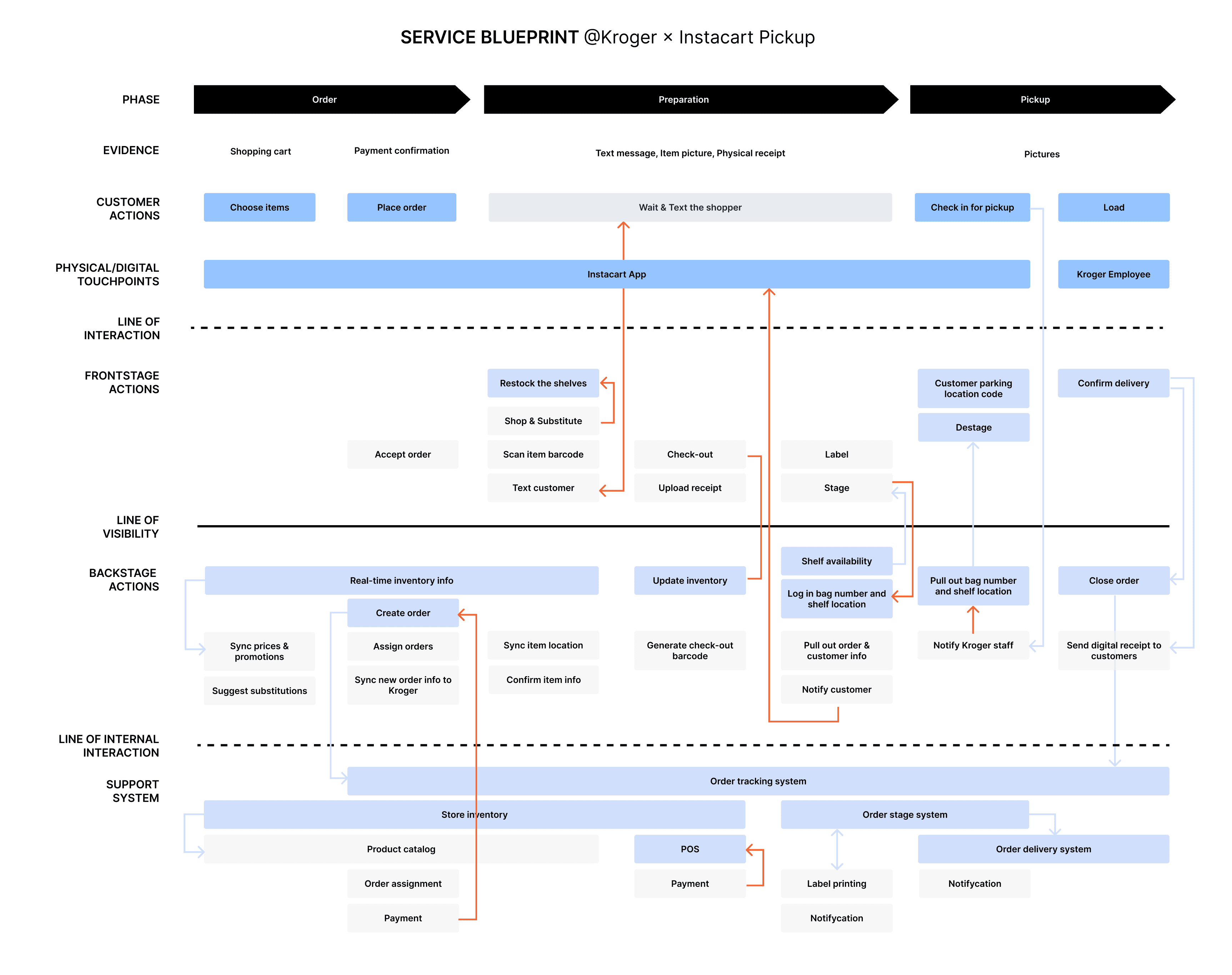 Service blueprint is very useful in understanding process that involves both fronte-end interaction and backend systems. I used arrows to represent how information flows from one system to another, which were key touchpoints my solutions would focus on.